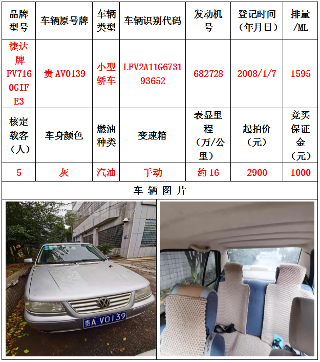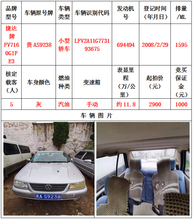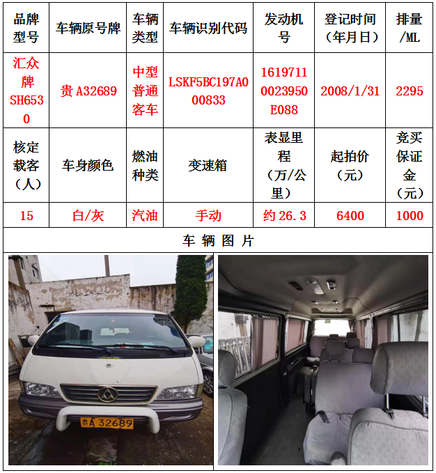 本次拍賣會(huì)的拍賣標(biāo)的共計(jì)10輛車,分別為帕薩特牌SVWZ183LJI小型轎車一輛、匯眾牌SH6530中型普通客車一輛、別克牌SGM6517小型普通客車一輛、別克牌SGM7161LE小型轎車一輛、寶來牌BORA1.6小型轎車一輛、捷達(dá)牌FV7160GiFE3小型轎車五輛(詳情見下文),為打包整體拍賣,不作拆分,整體起拍價(jià):33900元,且只對(duì)標(biāo)的現(xiàn)狀進(jìn)行拍賣,不作任何質(zhì)量擔(dān)保。