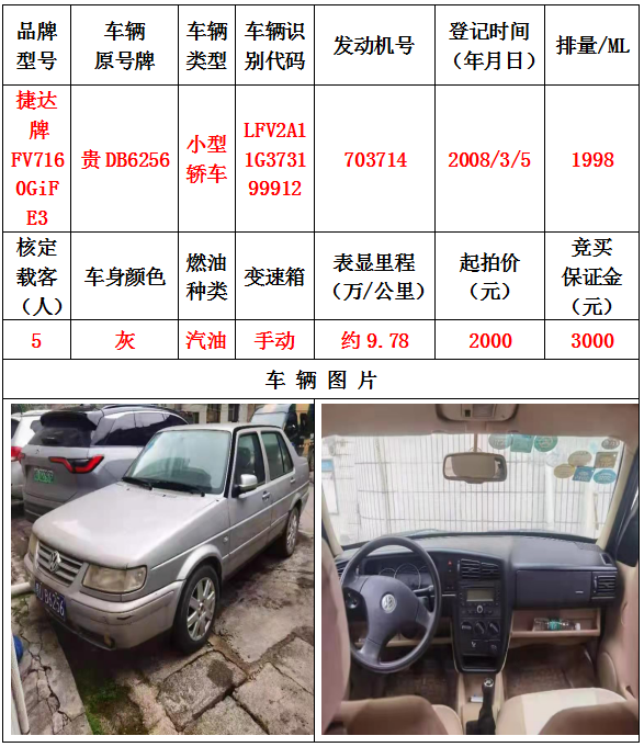 本次拍賣會的拍賣標的其中5輛車,分別為邁騰牌FV7187T小型轎車一輛、豐田牌GTM7200GB-NAV1小型轎車一輛、捷達牌FV7160GiF E3小型轎車一輛、帕薩特牌SVW7203FPi小型轎車一輛、帕薩特牌SVW7203FPi小型轎車一輛,為打包整體拍賣,不作拆分,整體起拍價:42400元,且只對標的現(xiàn)狀進行拍賣,不作任何質(zhì)量擔保。