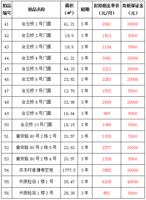 2021年1月28日上午9:00拍賣標(biāo)的共計(jì)40個(gè)標(biāo)的,其中:1—34號(hào)標(biāo)的目前均為租賃狀態(tài),如承租人參與競(jìng)租,其享有同等價(jià)位優(yōu)先購(gòu)買權(quán),其余35—40標(biāo)的為閑置狀態(tài)。