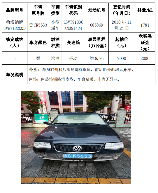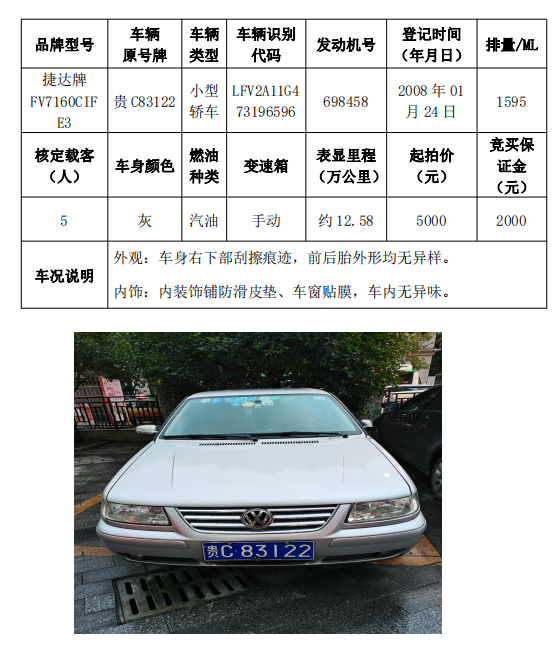 本次拍賣會的拍賣標(biāo)的(拍品編號1-5共計5輛車),分別為桑塔納牌、捷達(dá)牌、昊銳牌、獵豹牌,為打包整體拍賣,不作拆分,整體起拍價:77200元,且只對標(biāo)的現(xiàn)狀進(jìn)行拍賣,不作任何質(zhì)量擔(dān)保。