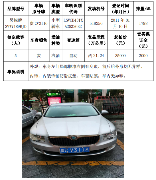 受委托,我公司定于2021年5月14日(星期五)下午14:30在遵義市匯川區(qū)廈門路13號中國農(nóng)業(yè)銀行遵義分行16樓會議室公開拍賣以下標(biāo)的:桑塔納牌、捷達(dá)牌、昊銳牌、獵豹牌共計5輛機(jī)動車。