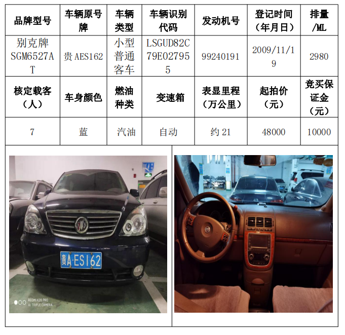 拍品編號 3:別克牌 SGM6527AT 小型普通客車一輛