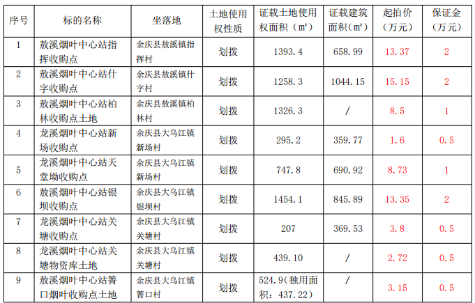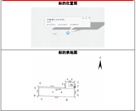 該標(biāo)的位于余慶縣龍溪鎮(zhèn)關(guān)塘村,標(biāo)的建筑物已拆除,證載土地面積:約493.1㎡,土地使用權(quán)性質(zhì):劃拔,土地證載用途:煙葉收購,土地證號(hào):余國用(2007)第905號(hào)。