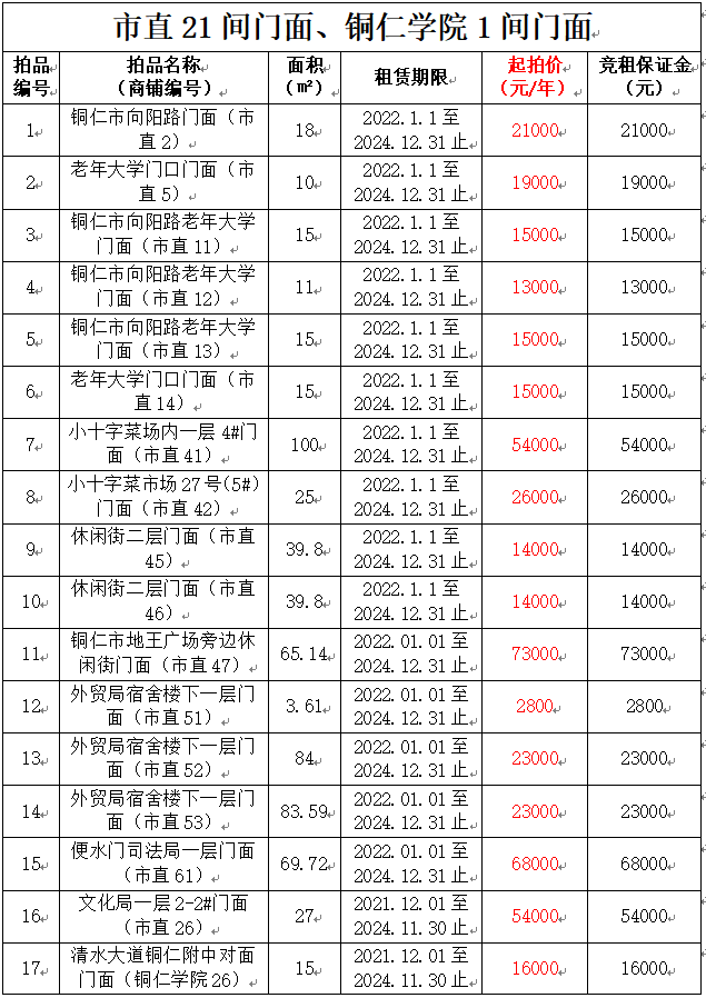 受委托,我公司定于2021年10月27日(星期三)下午14:30時(shí),在銅仁市碧江區(qū)川硐教育園區(qū)誠信路銅仁市公共資源交易中心開標(biāo)六室(拍賣大廳)公開拍賣以下位于銅仁市的標(biāo)的租賃權(quán):
